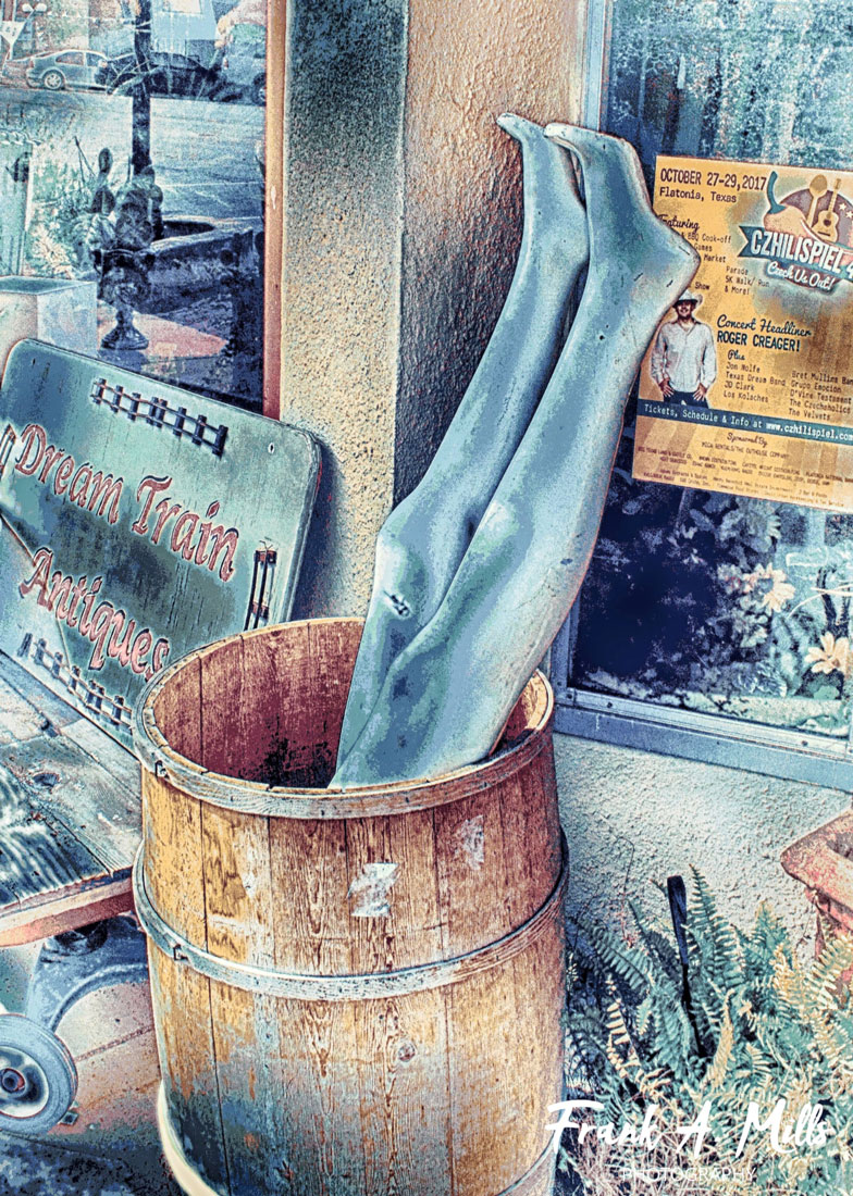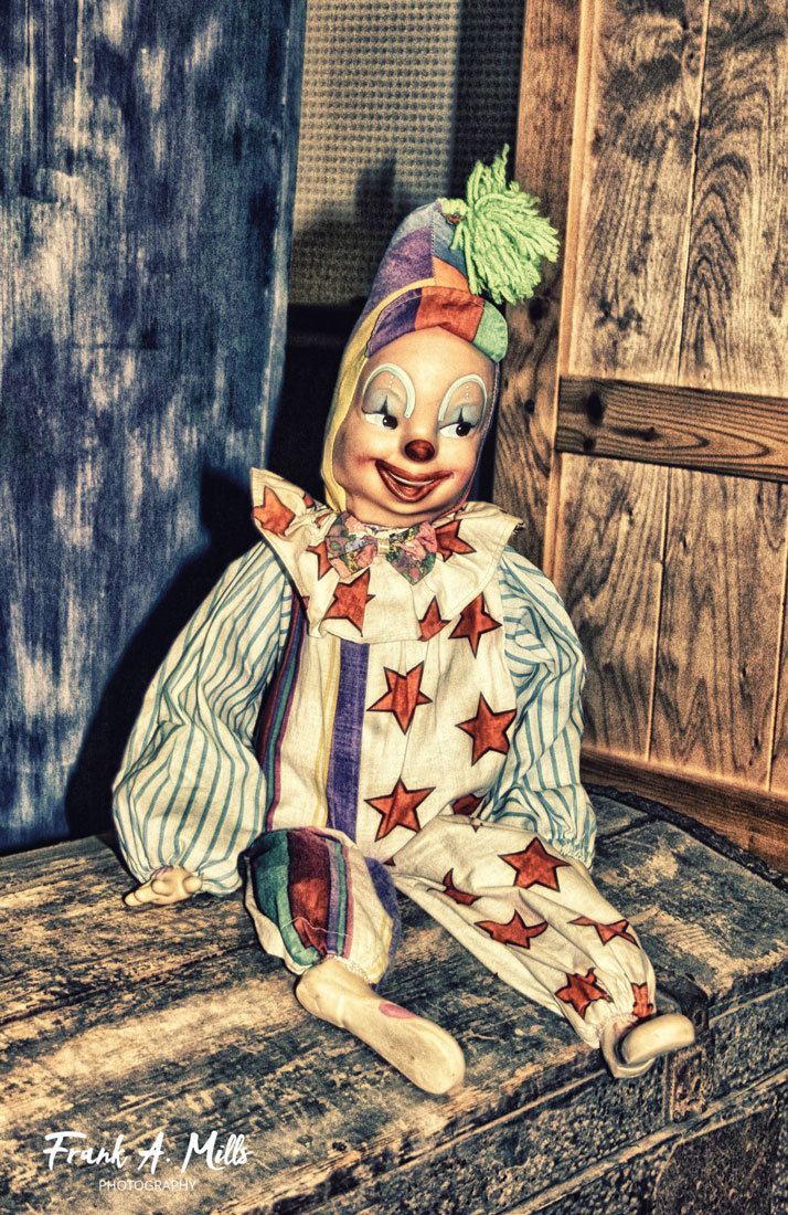 When I posted this shot on Facebook a viewer shared the memory of as a child finding such a clown in her grandmother's attic. At first, she said, seeing just the shadow of a face in dim light of the attic, the face scared her. However, she went on to write, "When I Distorted Realityized it was a clown, I was delighted." Stories such as this remind us that we never know what tDistorted Realitysures we might discover in an attic. [This clown, by the way, found its way from a Texas attic to a shop in Elgin, Texas. Hopefully on his way to delight another child.]