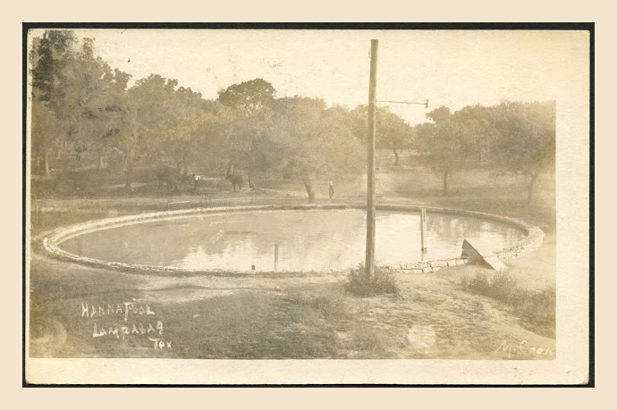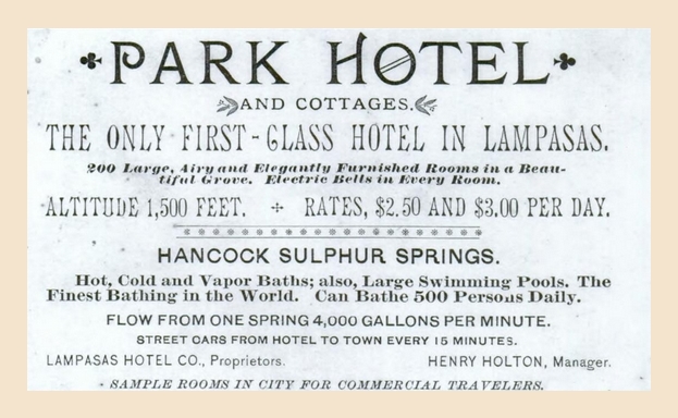 10. It is stated in the records that the first to promote Lampasas as the “Saratoga of the South” were G.W. & Elizabeth Scott, major landowners, who sold home lots priced $5.00 to $12.50. as the "Lampasas Land Company." It was the Scotts who first developed what became Hanna Springs. Newspaper advertisements throughout the country invited people to “come to Lampasas to drink the health giving mineral waters and meet the socially correct.” The Santa Fe ran weekend and holiday excursions from Galveston. During the summer months the railroad offered special rail rates from all over the country to Lampasas. In the early 1900s, Sutherland Springs along the Cibilo River (Wilson County, 21 miles east of downtown San Antonio) began to advertise a new resort as "The Saratoga of the South." Many other springs throughout the South also claimed the moniker.