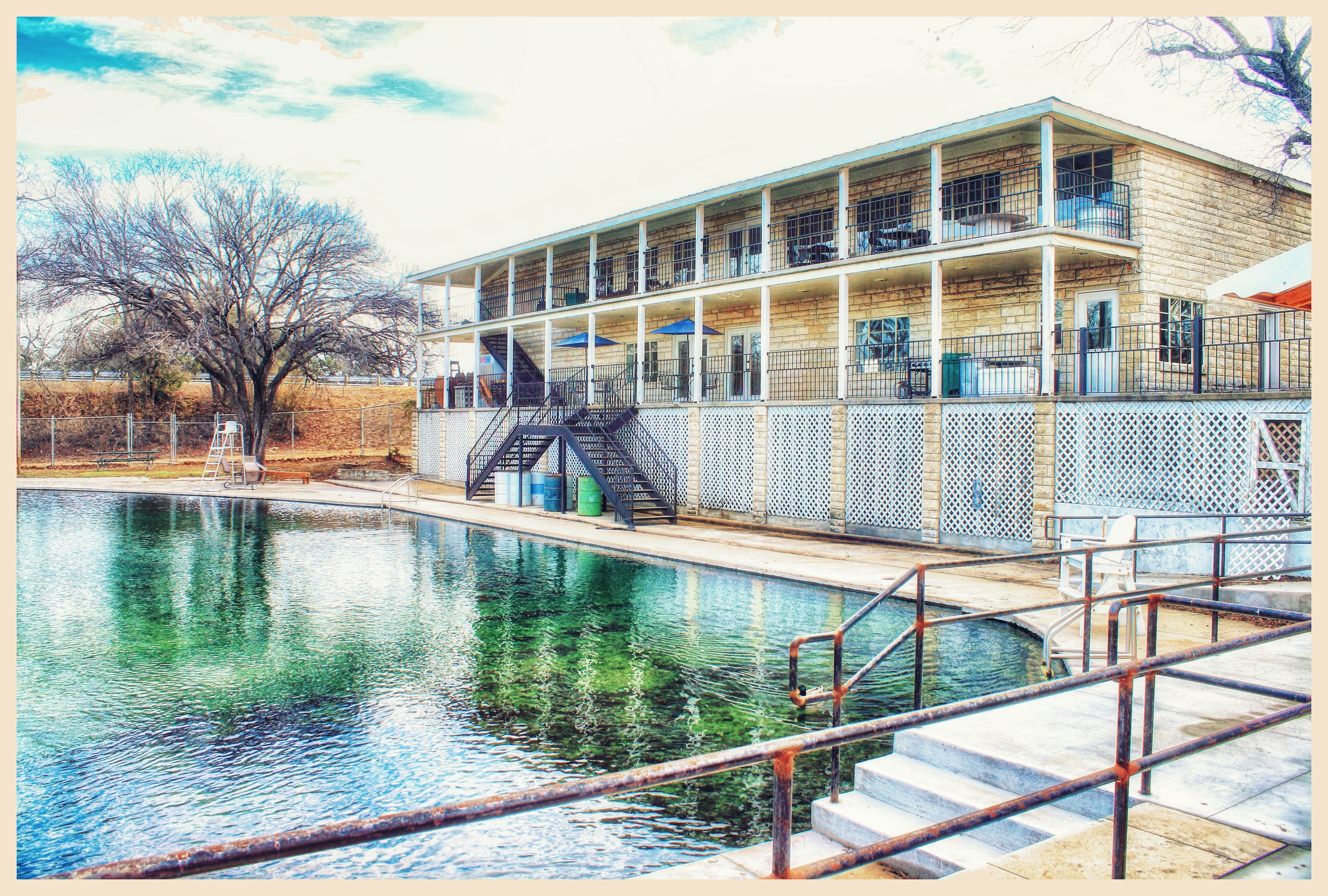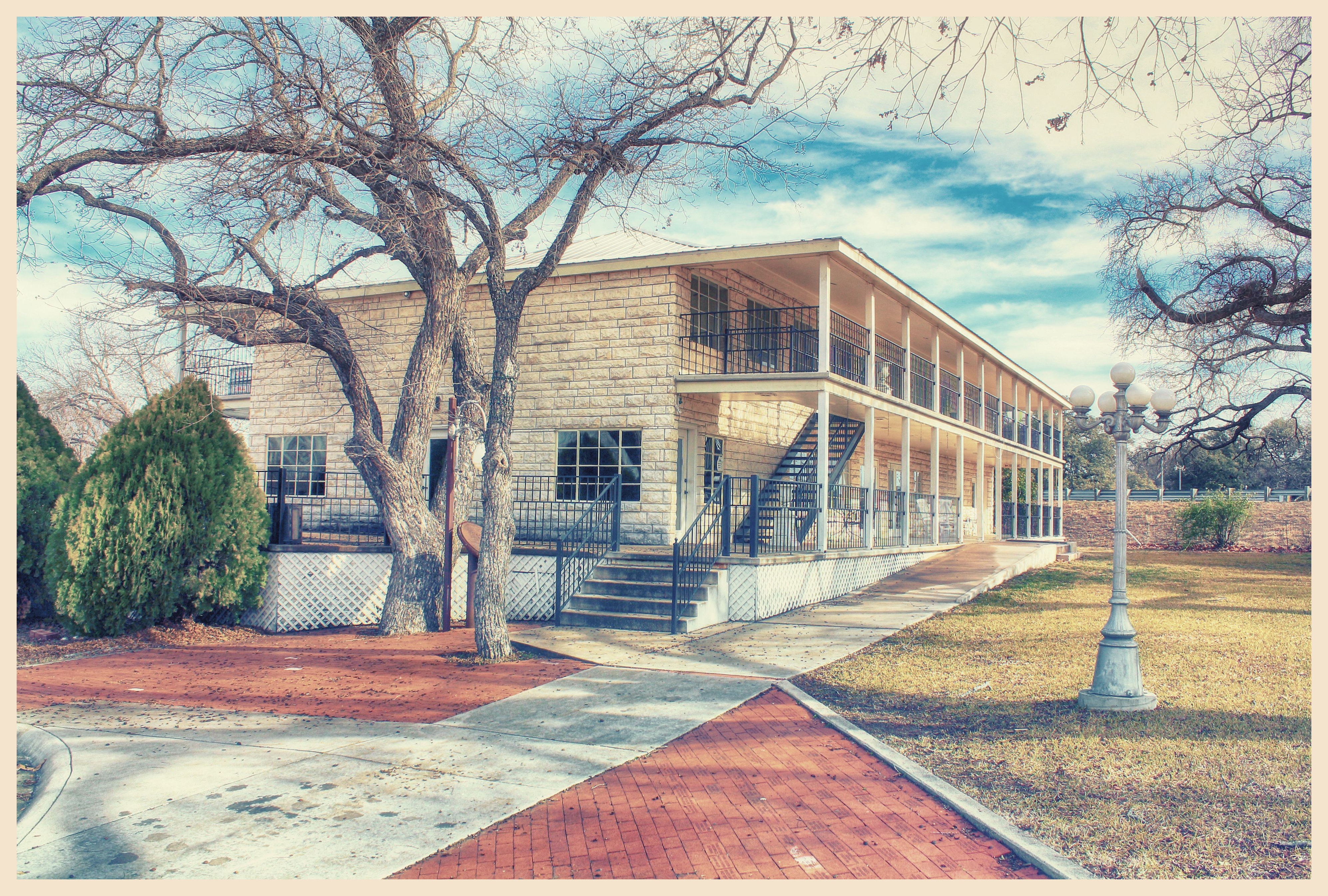 The two-story frame building included a reception hall and changing room for the pool. The second floor provided an open air dance hall. The hall featured both local and nationally known bands. In 1936 the city took ownership of the park. A few years later, during World War II, the Army leased the park for recreation use by the soldiers stationed at nearby Camp Hood (Fort Hood). It was renamed "Panther Park." In 1947 a golf course was built to the west and the Hostess House received a limestone veneer. Further renovations took place the following year. The park became a popular picnic area. The people of the area continued to flock to the pool and dances. By the 1990s the complex had fallen Today the building is still owned by the city and is once again restored.
