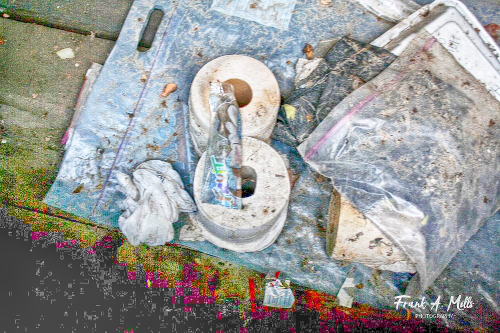 I was taking pictures of a semi-abandoned building that had become a squat for the homeless, when one of those who lived there asked what I was taking pictures for. After I told him, his response was, "Come with me." Entering a small room, "This is our bathroom. It's all we have. We try to keep it clean (note the plastic baggies)." He went on, "Every place chases us out when we try to use their restroom."